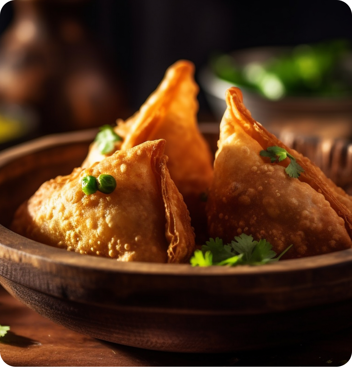 Crispy pastry filled with mildly spiced green peas and minced potatoes