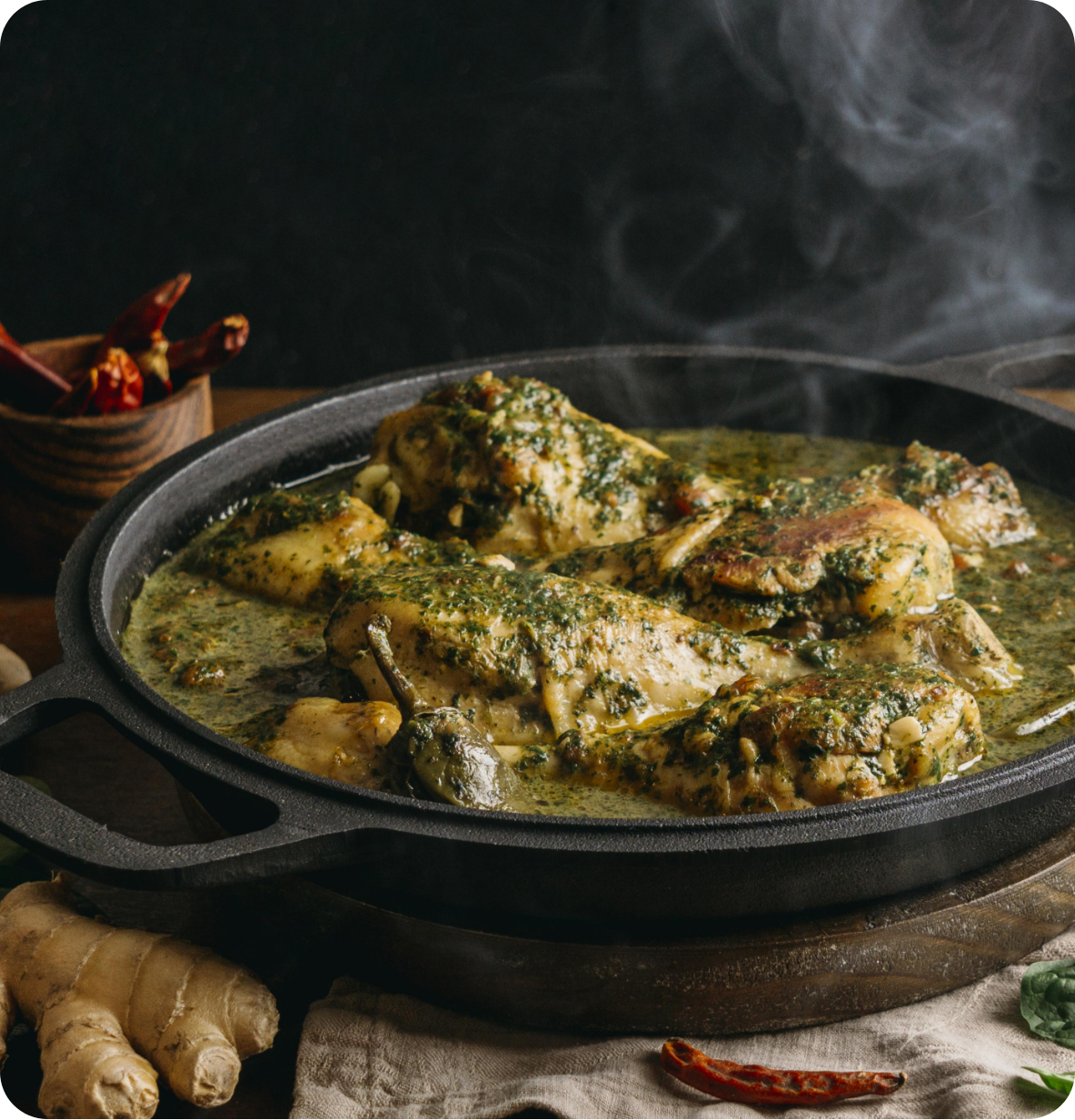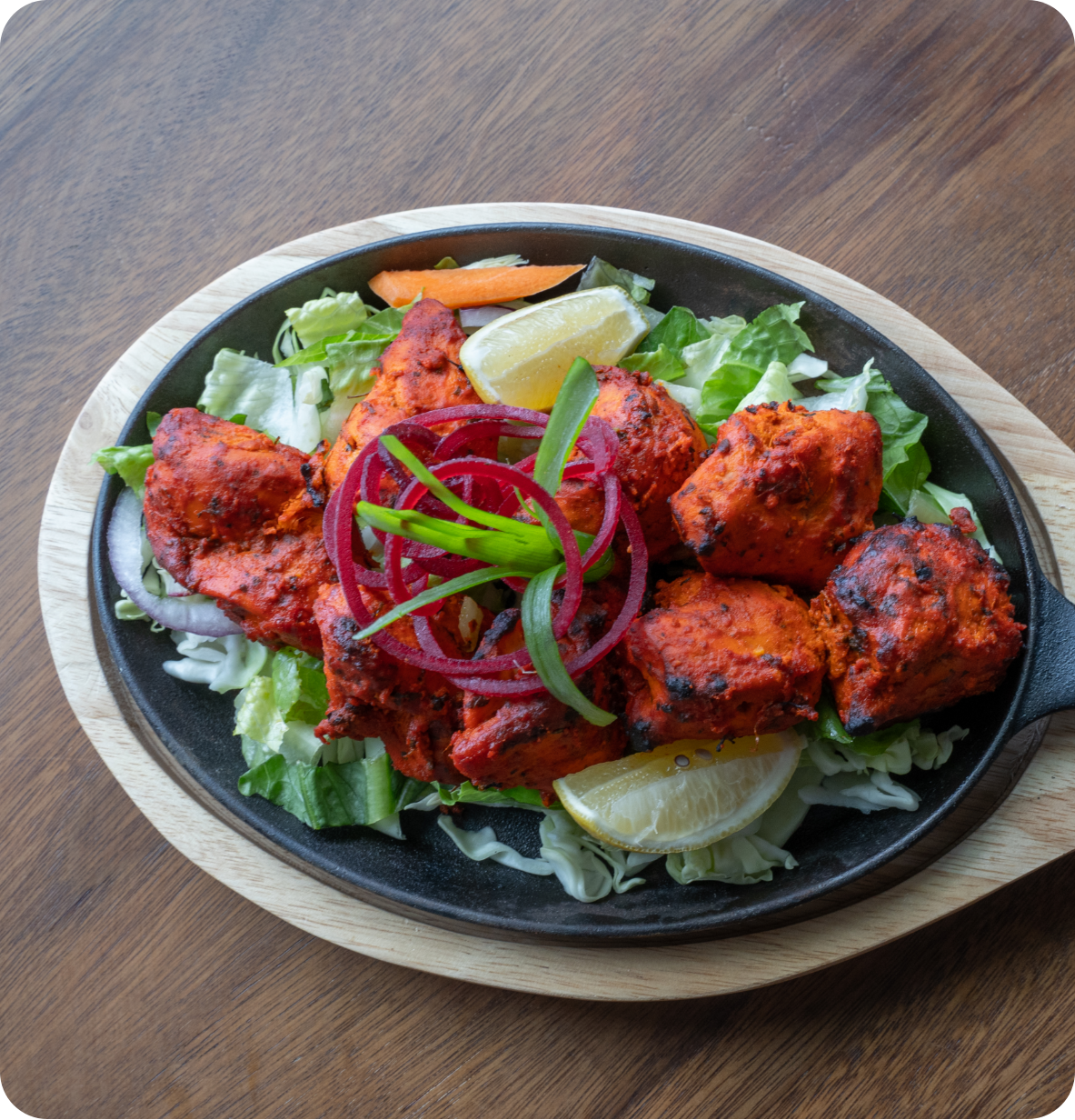 Chicken marinated in yoghurt with a colorful spices blend, roasted in tandoor, then served with seasonal greens
