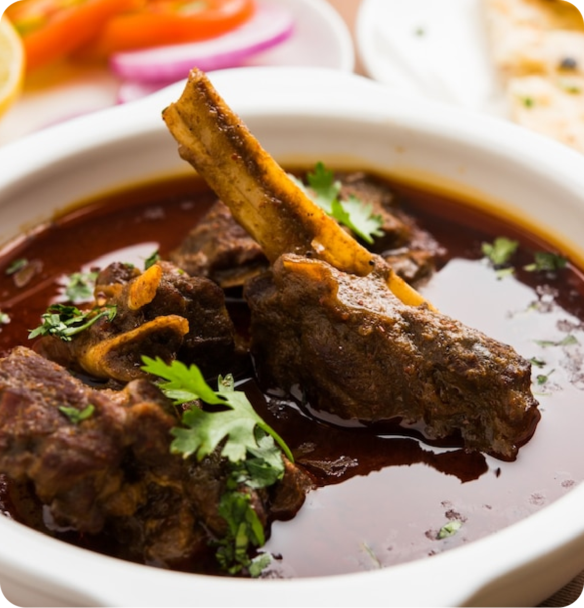tender, slow-cooked mutton in a rich, flavorful gravy. Infused with aromatic spices and garnished with fresh ginger, coriander, and a squeeze of lime, this dish offers a melt-in-the-mouth experience.