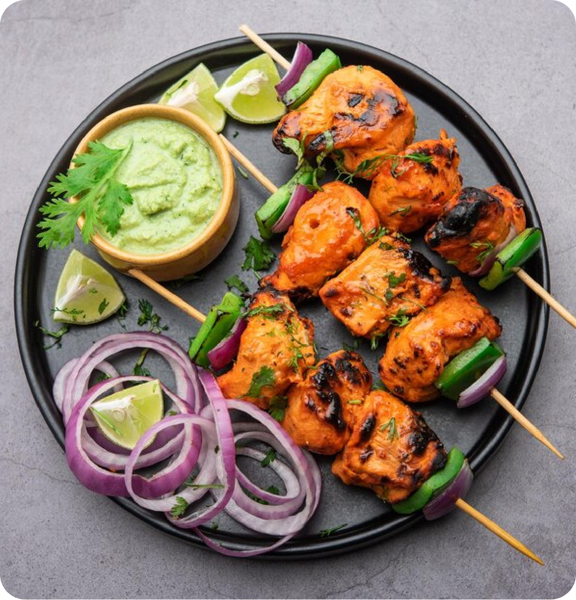 Boneless chicken breast pieces, breast marinated in special yoghurt, herbs, and spices and roasted in tandoor on skewers